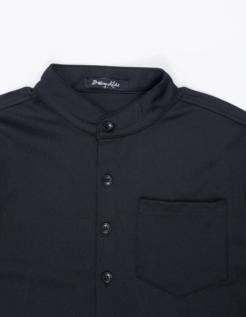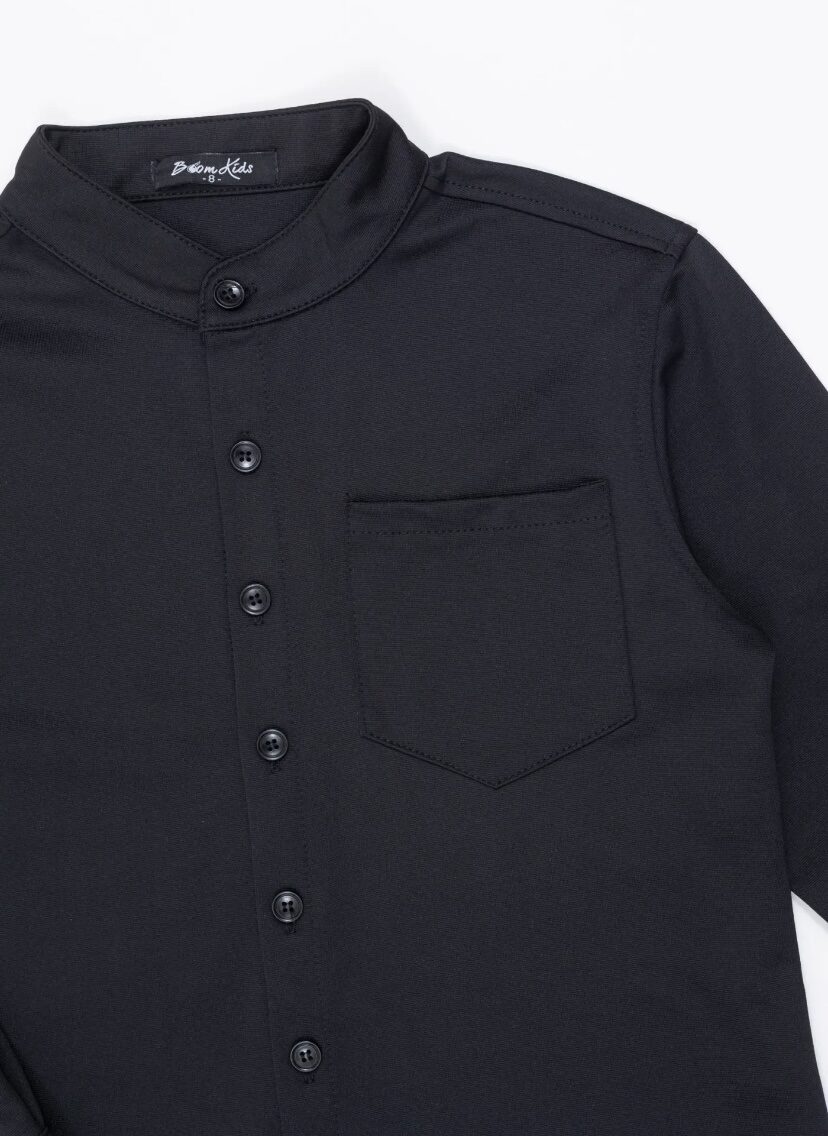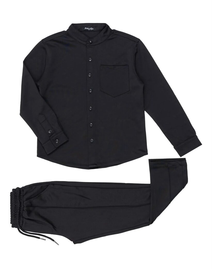Deze stoere jongensset bestaat uit een zwarte button-up overhemd met borstzakje en bijpassende comfortabele broek met elastische tailleband en trekkoord. Het tijdloze design maakt deze set geschikt voor zowel casual als nette gelegenheden. Gemaakt van een zachte en ademende stof voor optimaal draagcomfort. Perfect om te combineren met sneakers of nette schoenen voor een complete look.