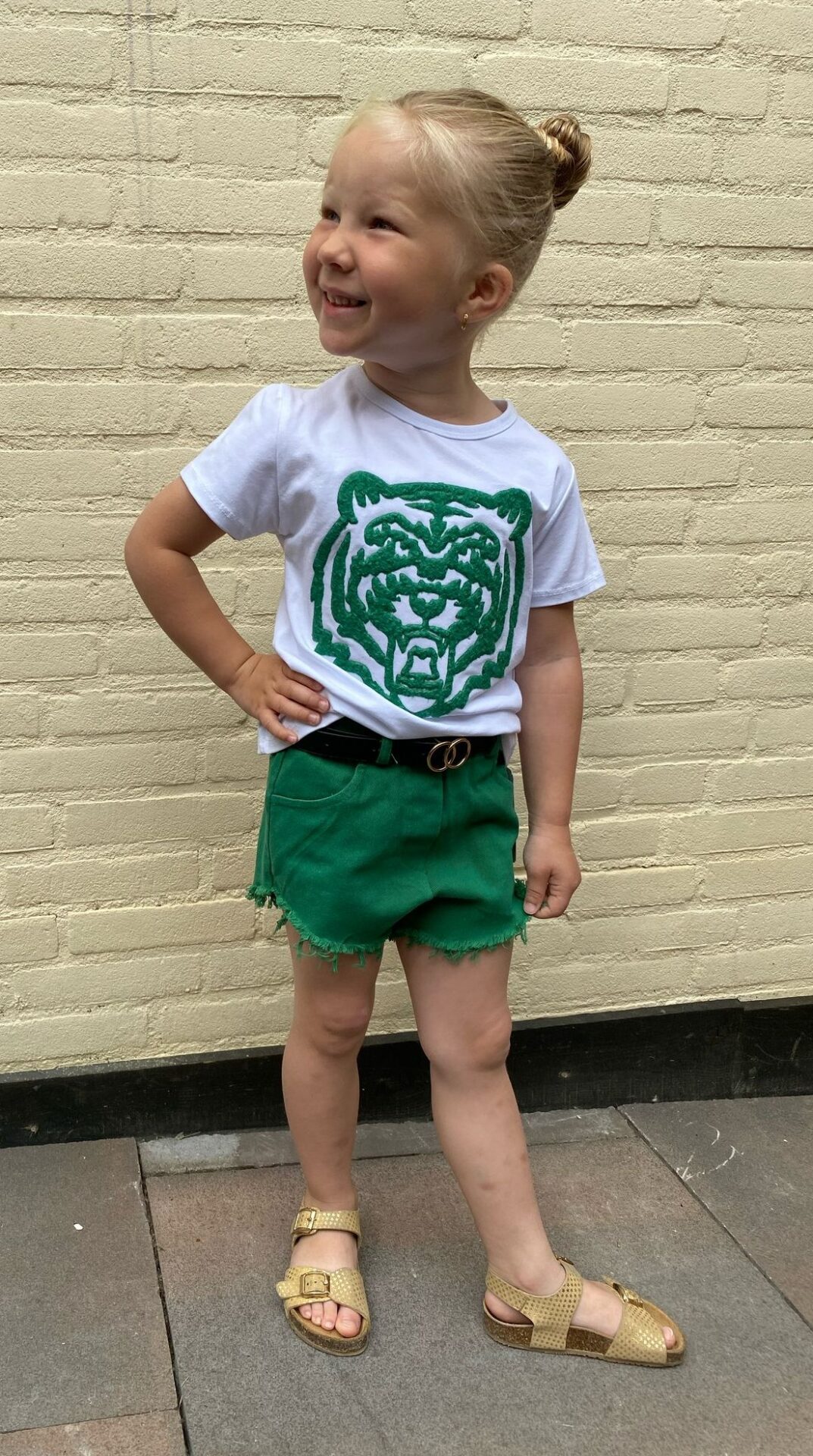 Dit setje is alles wat jouw zomeroutfit nodig heeft: een frisse groene short met riempje én een witte T-shirt met edgy tijgerprint. Stoer, stijlvol en supercomfortabel