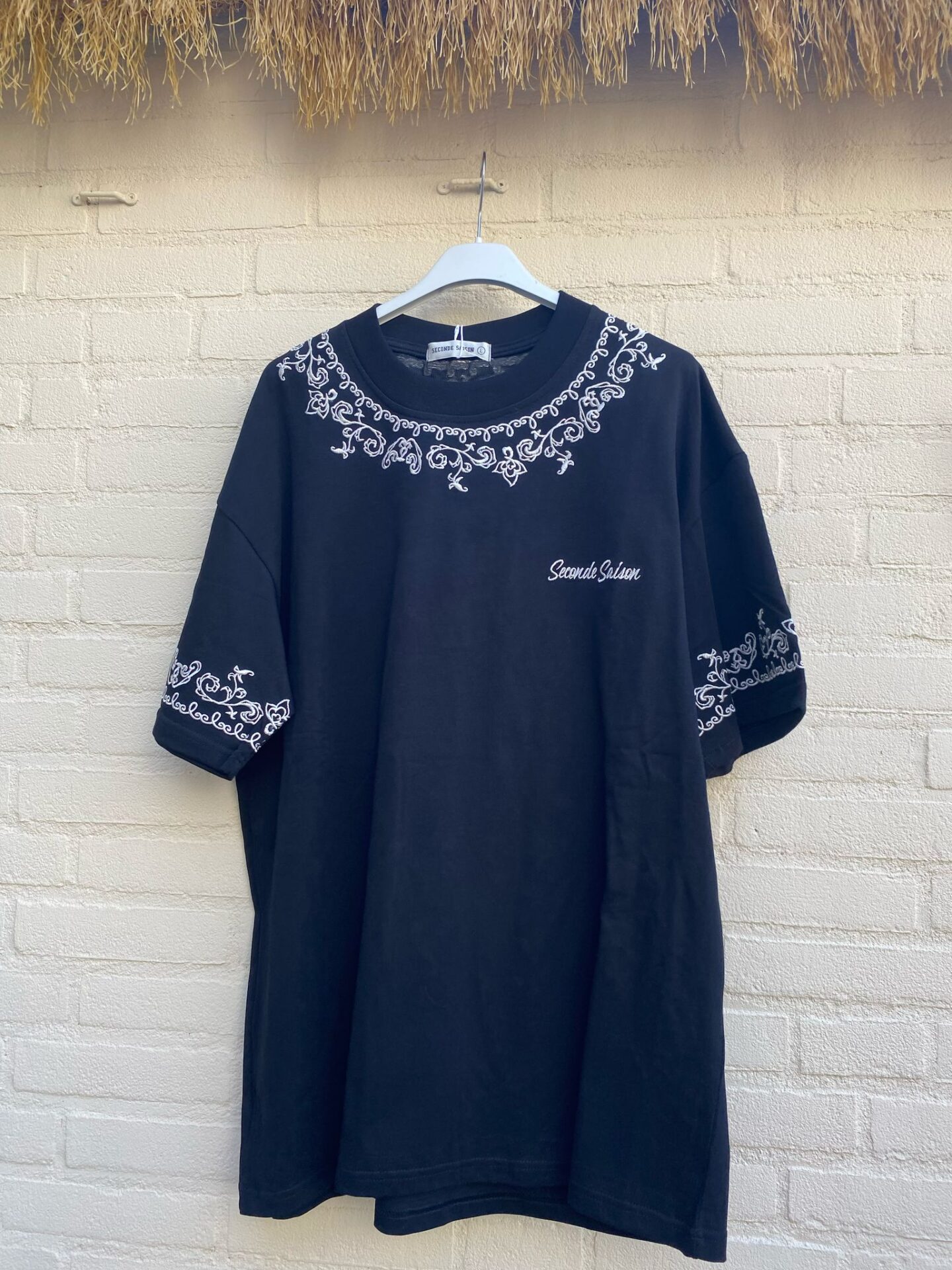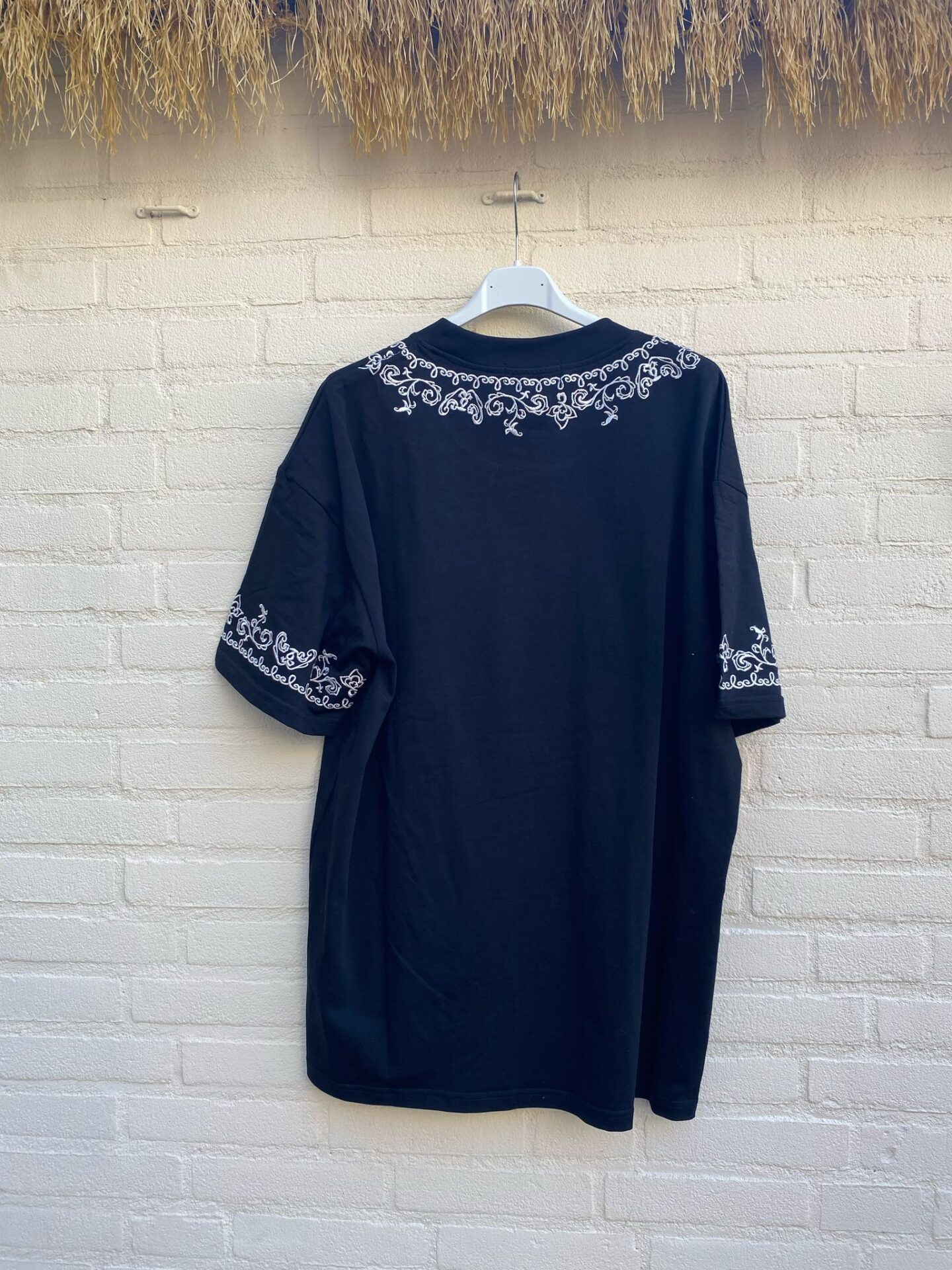 Dit stijlvolle zwarte herenshirt van Blend By You Fashion is een subtiele eyecatcher met klasse. De verfijnde gouden borduursels rond de hals en mouwen geven het shirt een luxueuze uitstraling. Op de borst prijkt elegant de tekst “Sacred Script”, waarmee je een unieke en spirituele touch toevoegt aan je look.