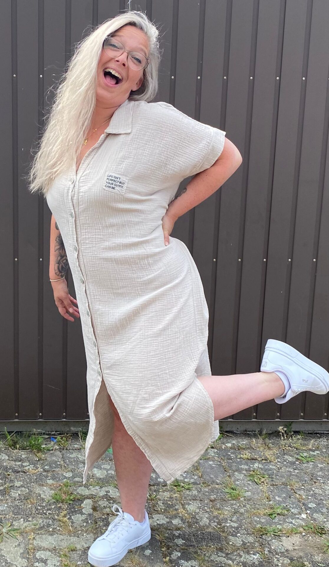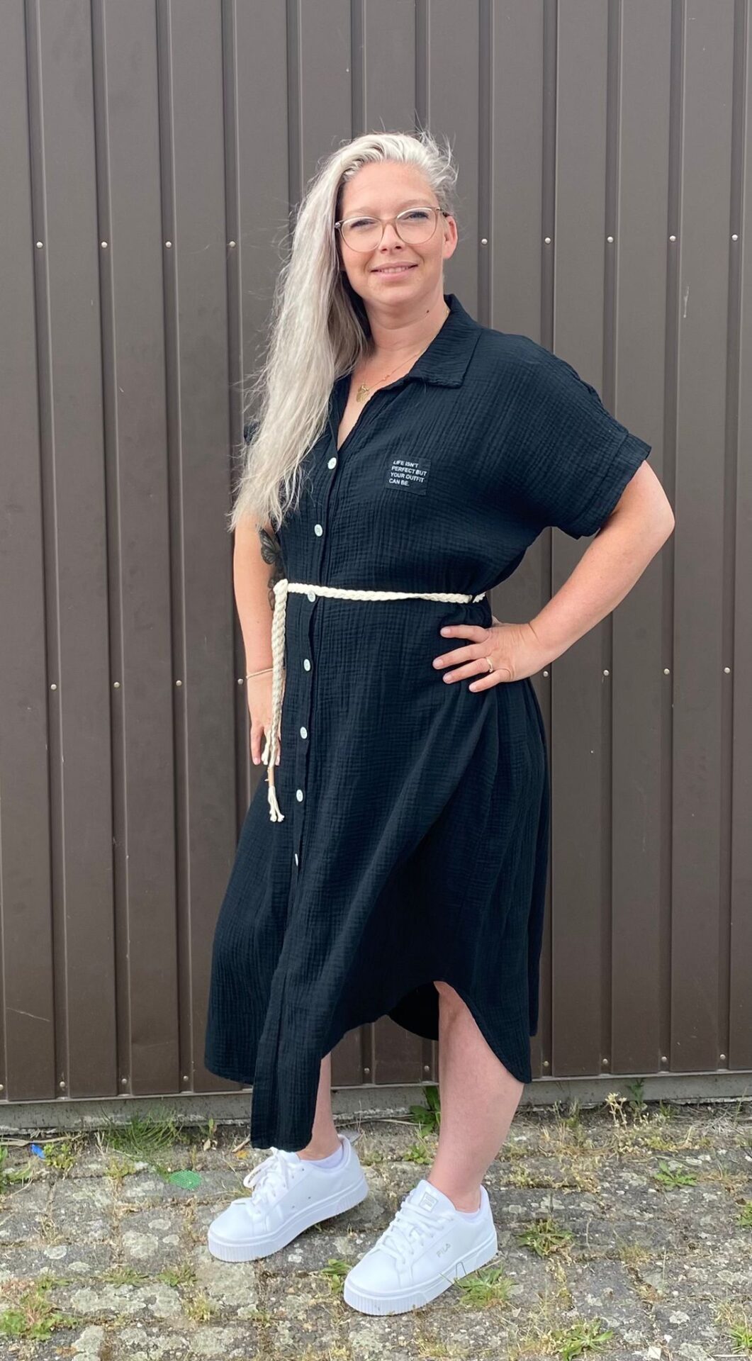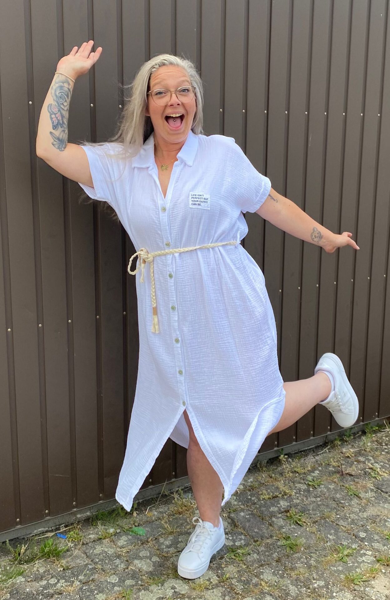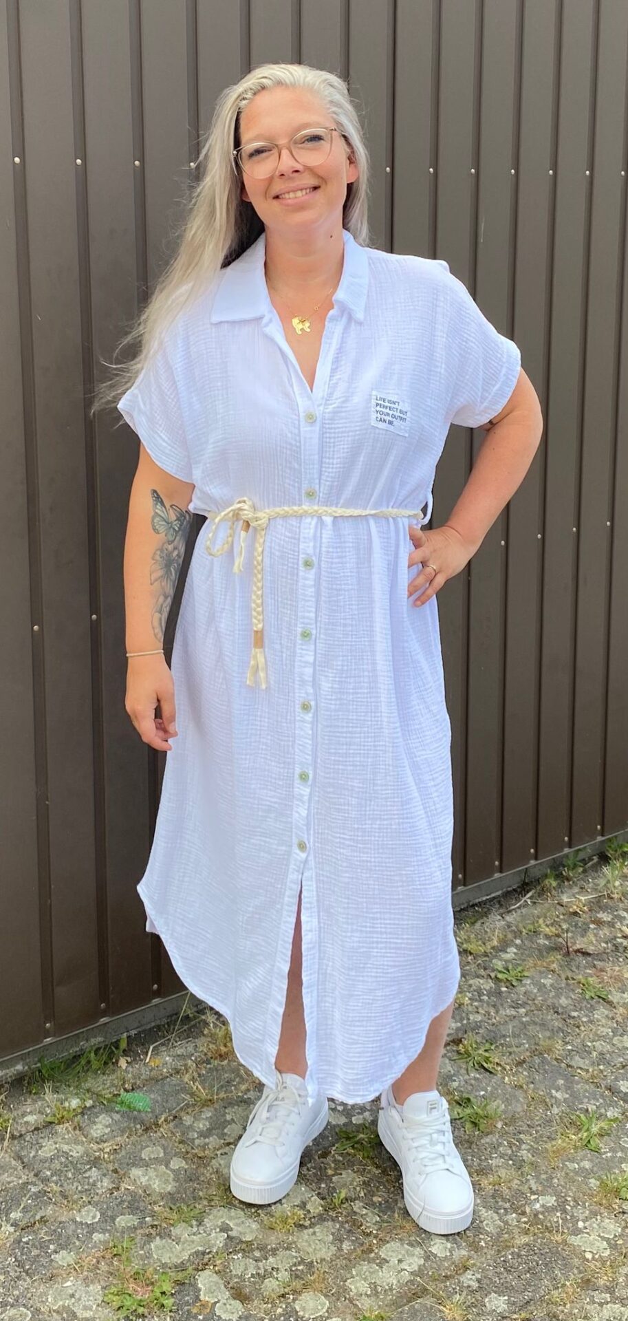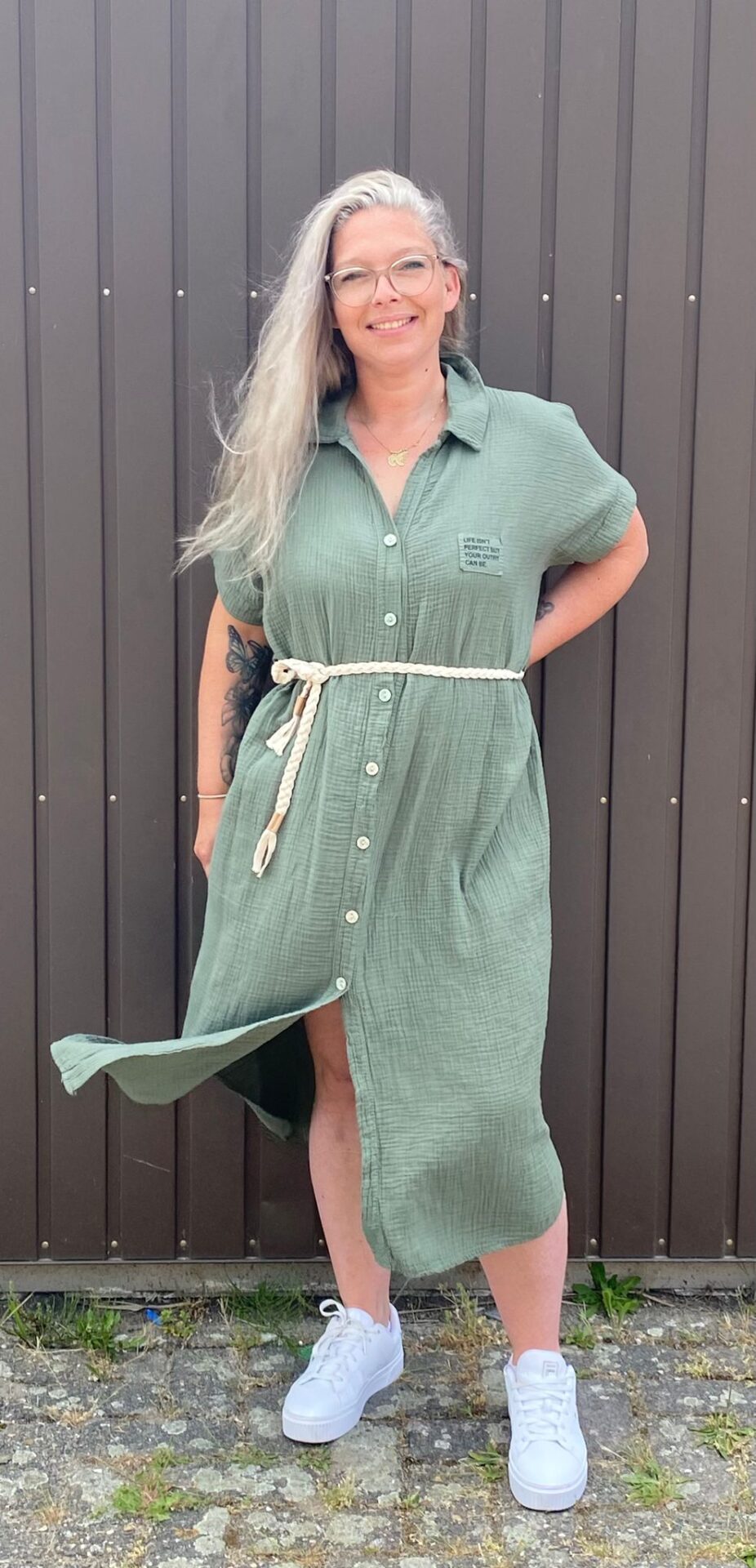 Deze luchtige jurk is jouw nieuwe go-to voor zonnige dagen! De jurk valt soepel en heeft een comfortabele, relaxte pasvorm met korte mouwen en een knoopsluiting van boven tot onder. De bijgeleverde touwceintuur zorgt voor een speelse touch én accentueert je taille op een nonchalante manier.