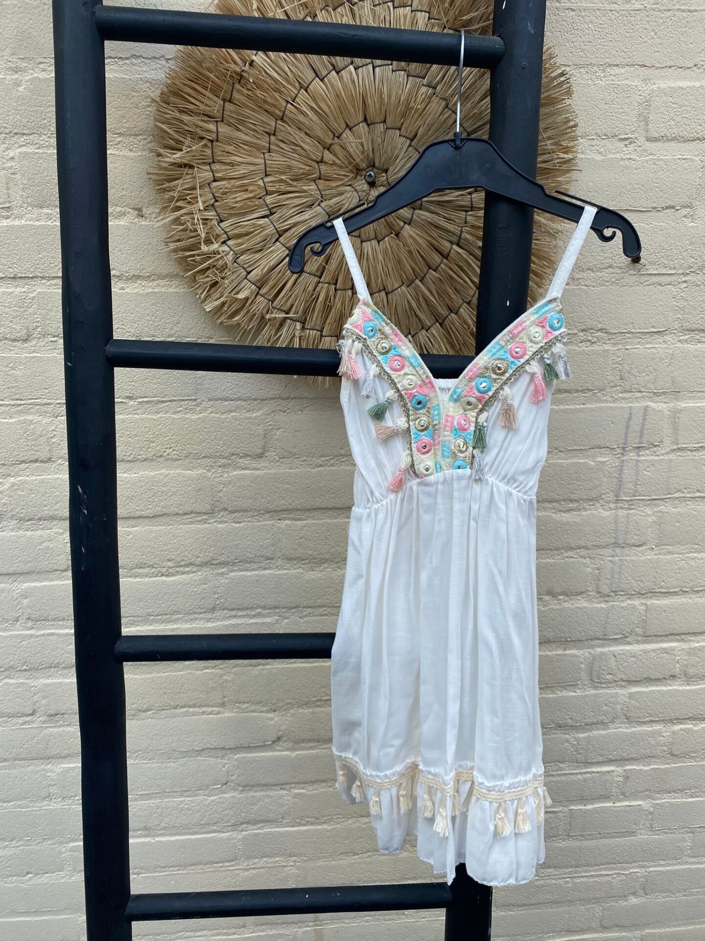 Laat jouw mini fashionista stralen in deze zomerse Ibiza jurk! Dit witte jurkje is gemaakt van een luchtige, zachte stof en is perfect voor zonnige dagen. De kleurrijke geborduurde details op het borststuk in combinatie met speelse kwastjes geven het jurkje een unieke Ibiza vibe. De verstelbare spaghettibandjes zorgen voor een fijne pasvorm, terwijl de franjes aan de onderkant zorgen voor extra flair bij elke stap.