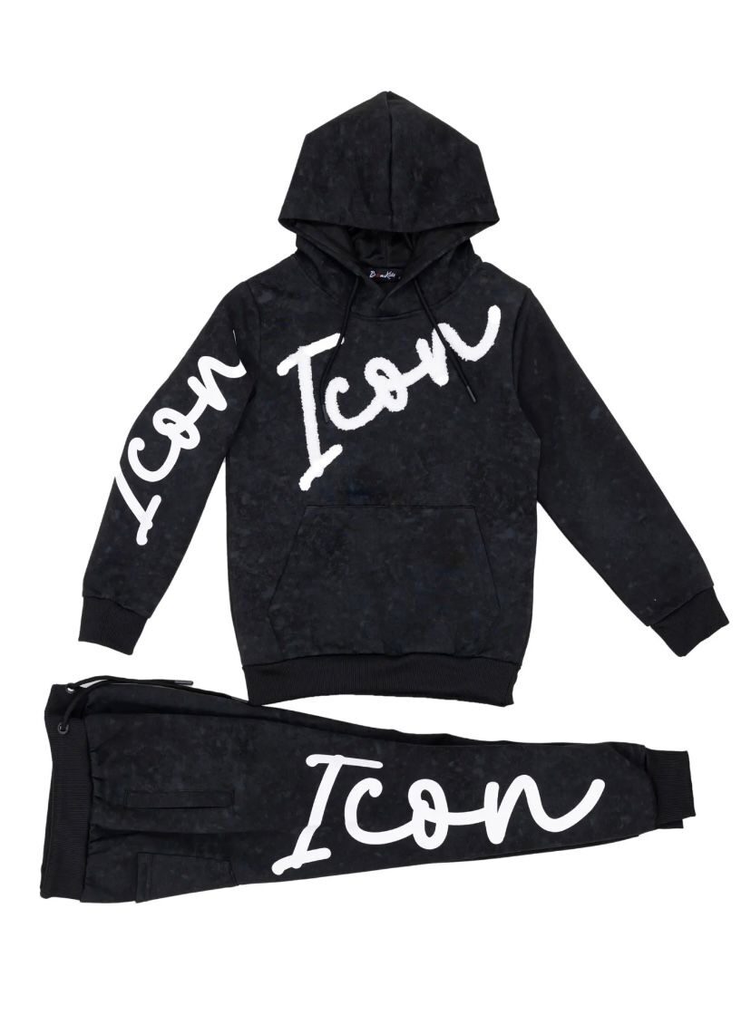Laat jouw mini stralen in dit ICON trainingspak voor jongens – de perfecte combinatie van comfort, stijl en attitude. Dit zwarte jongenspak is gemaakt van een zachte, hoogwaardige katoenmix en heeft een unieke washed look met opvallende witte ICON-print op de hoodie én de broek.