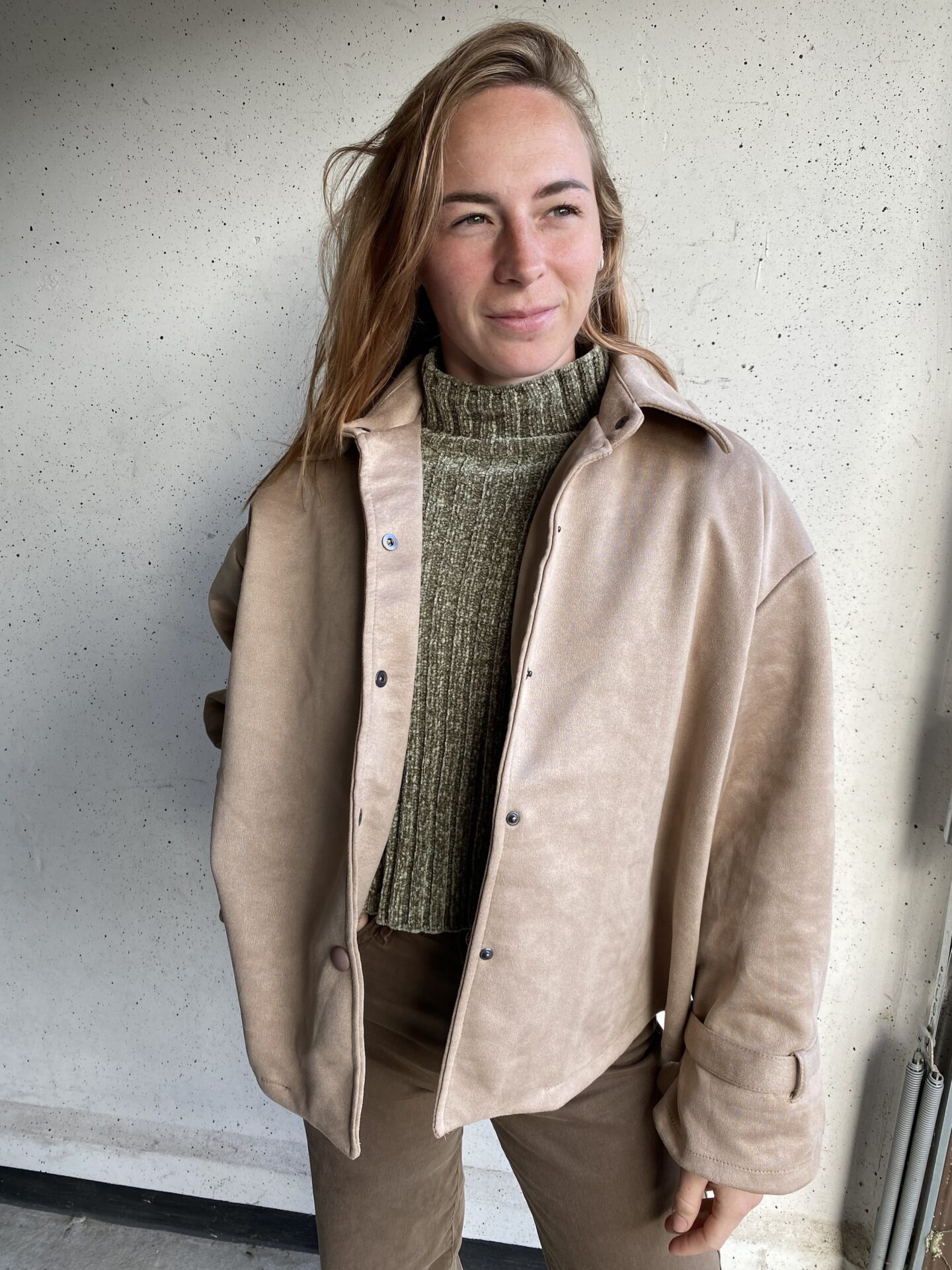 Dit trendy beige overshirt met suède look is dé musthave voor dit seizoen! Het jasje heeft een zachte, luxe uitstraling en combineert moeiteloos comfort met stijl. Dankzij de losse fit en stijlvolle drukknopen draag je hem zowel casual als chic.