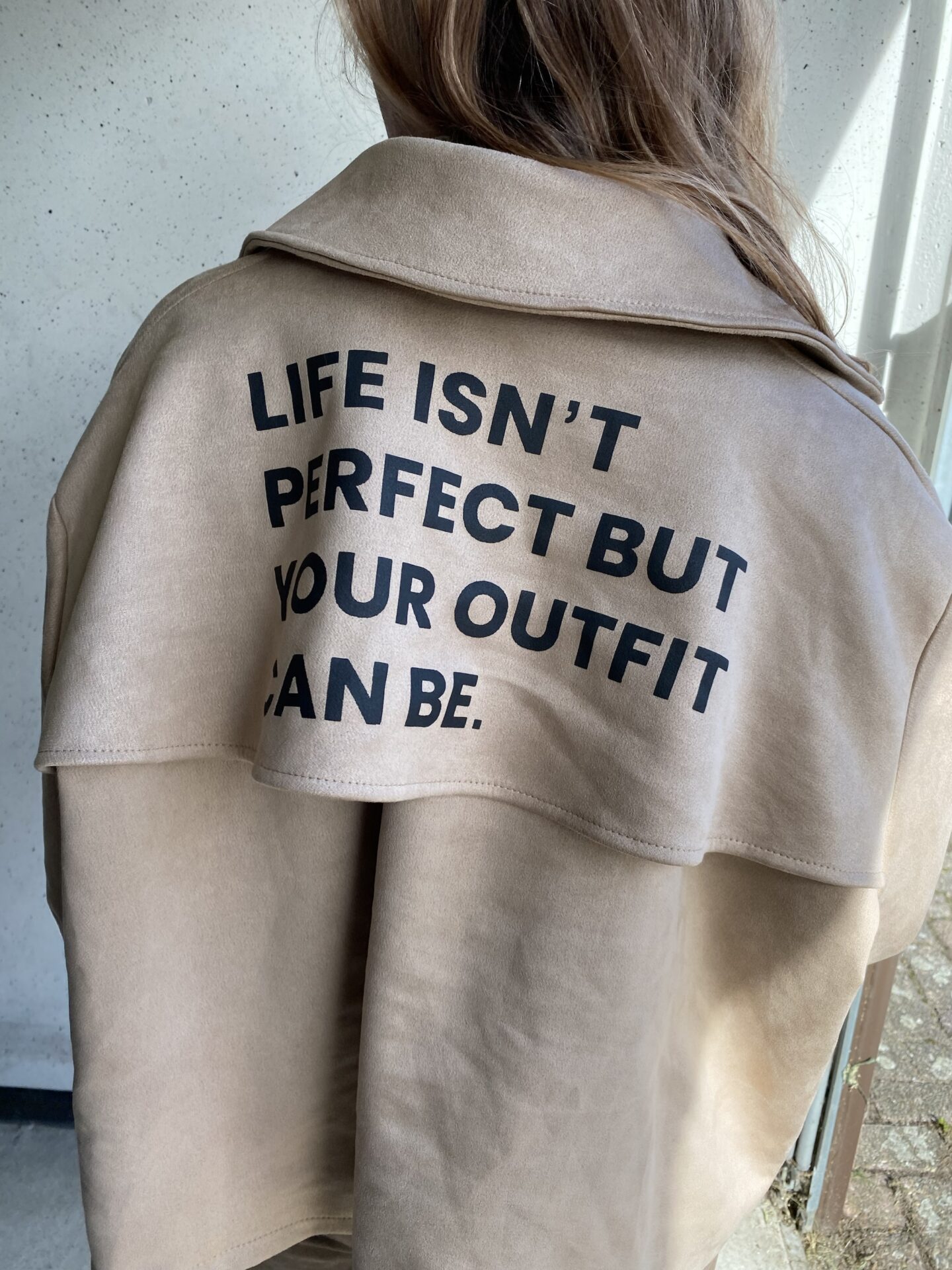 Quote op de rug: “Life isn’t perfect but your outfit can be”