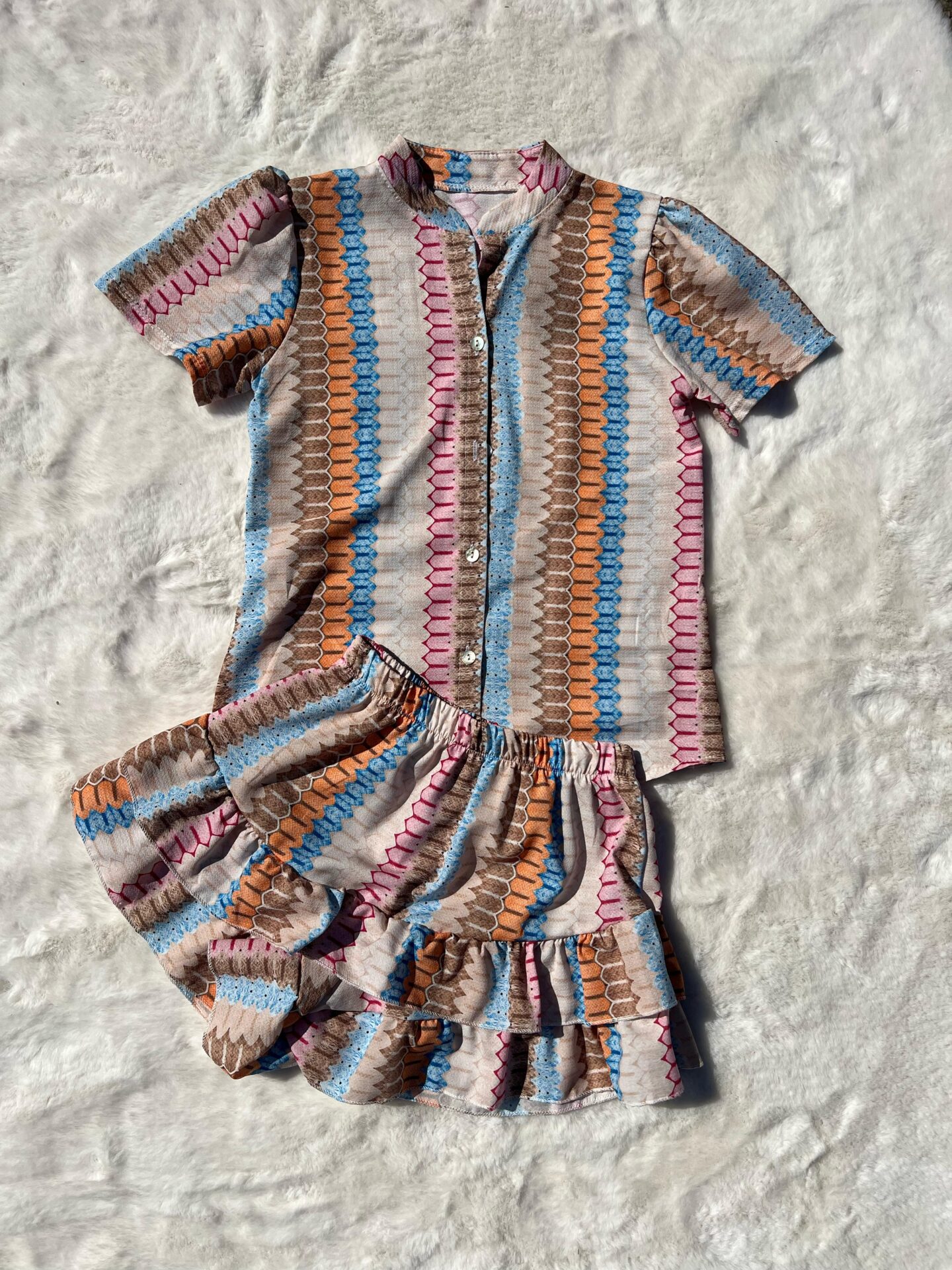 Laat je opvallen met dit speelse en kleurrijke setje, perfect voor de zonnige dagen! De outfit bestaat uit een luchtige blouse met korte mouwen, een elegante opstaande kraag en een knoopsluiting aan de voorkant. De bijpassende broekrok heeft een elastische taille en speelse laagjes voor een vrolijk en zwierig effect. De grafische print in tinten van blauw, oranje, roze en beige zorgt voor een trendy en unieke uitstraling. Een echte blikvanger voor elke gelegenheid!