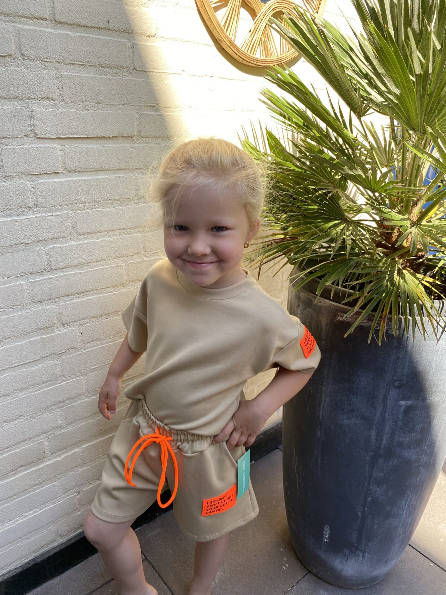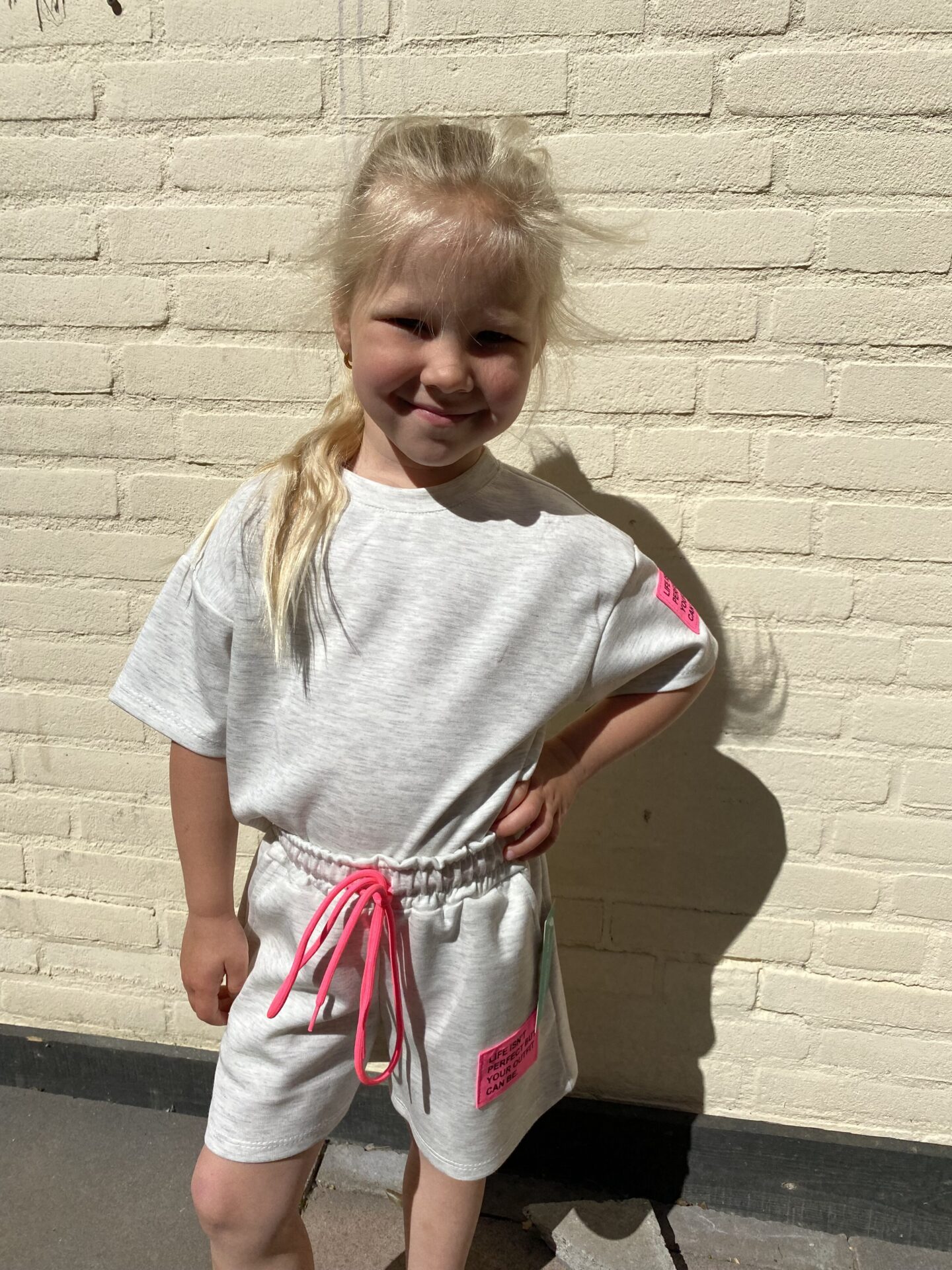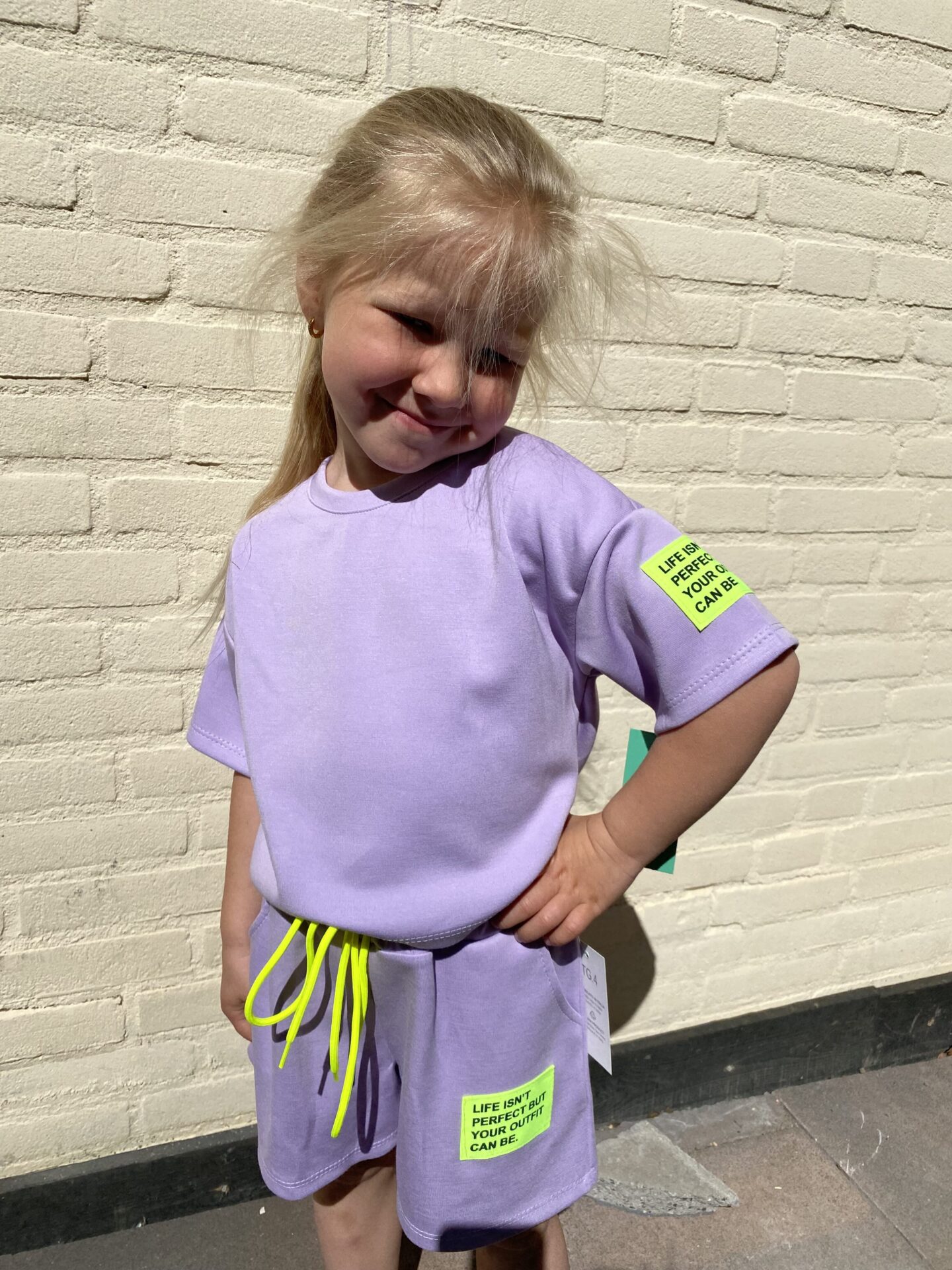 Deze vrolijke en comfortabele meisjes set is een echte must-have voor de zomer! Het tweedelige setje bestaat uit een cropped T-shirt met bijpassende short, beide gemaakt van een zachte, ademende katoenmix. De top heeft een speelse boxy fit met opvallend gekleurde tekstpatches op de mouw voor een trendy touch. De short is voorzien van een elastische tailleband met gekleurde strikkoordjes en een bijpassende patch op het been.