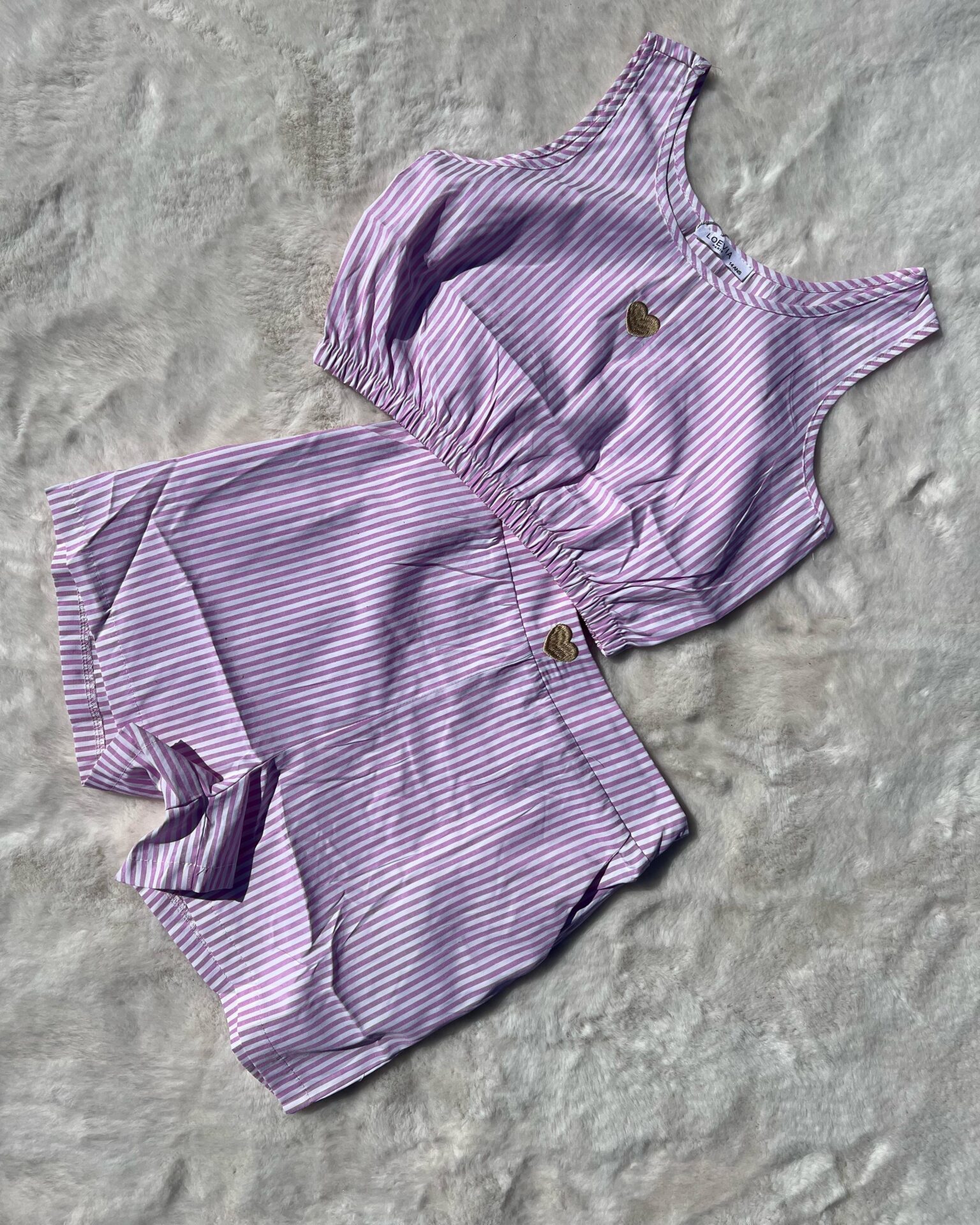 Stralend en speels! Dit prachtige tweedelige outfit bestaat uit een roze hemdje en bijpassende short, beide afgewerkt met fijne witte streepjes. Het hemdje heeft een comfortabele pasvorm met een elastische taille en een ronde halslijn. Op de borst siert een subtiel goudkleurig hartje, dat het geheel een lieve en stijlvolle touch geeft. De short sluit perfect aan en heeft charmante splitjes aan de zijkanten voor extra bewegingsvrijheid. Ideaal voor zonnige dagen of relaxte momenten in stijl!