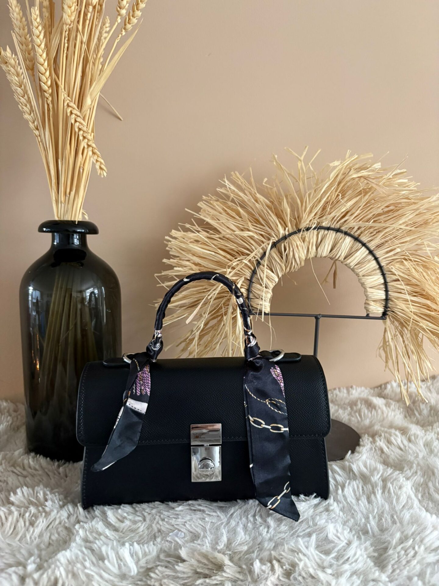 De handvatten zijn subtiel afgewerkt met een elegante sjaaldetail, wat zorgt voor een speelse maar verfijnde touch. Dankzij het compacte maar praktische formaat is deze zwarte handtas perfect voor dagelijks gebruik, maar ook ideaal als avondtas of voor speciale gelegenheden.