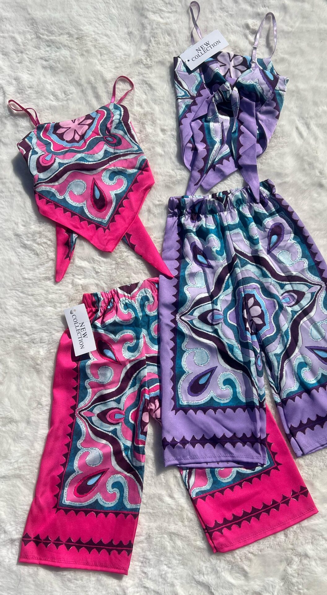 Deze co-ord set bestaat uit een speels gebonden topje met verstelbare spaghetti-bandjes en een bijpassende wijde broek. De levendige roze met groene print met sierlijke patronen geeft een frisse en vrolijke uitstraling, perfect voor zonnige dagen, vakanties of stranduitjes. De broek heeft een elastische tailleband voor extra comfort.